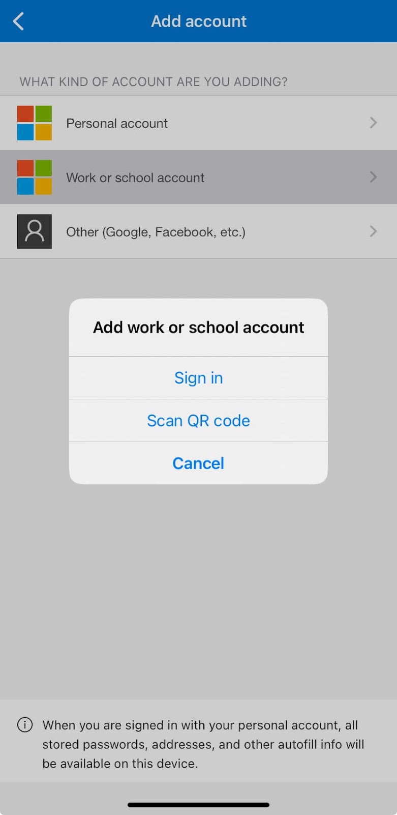 - Add work or school account then Scan QR code.